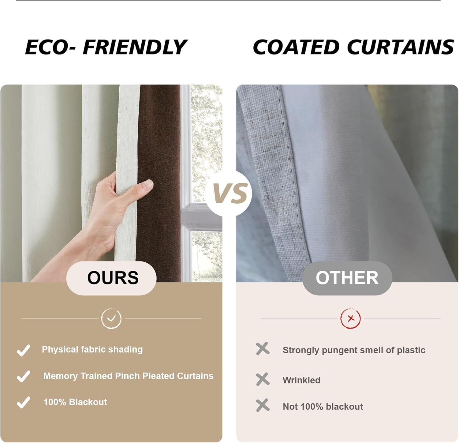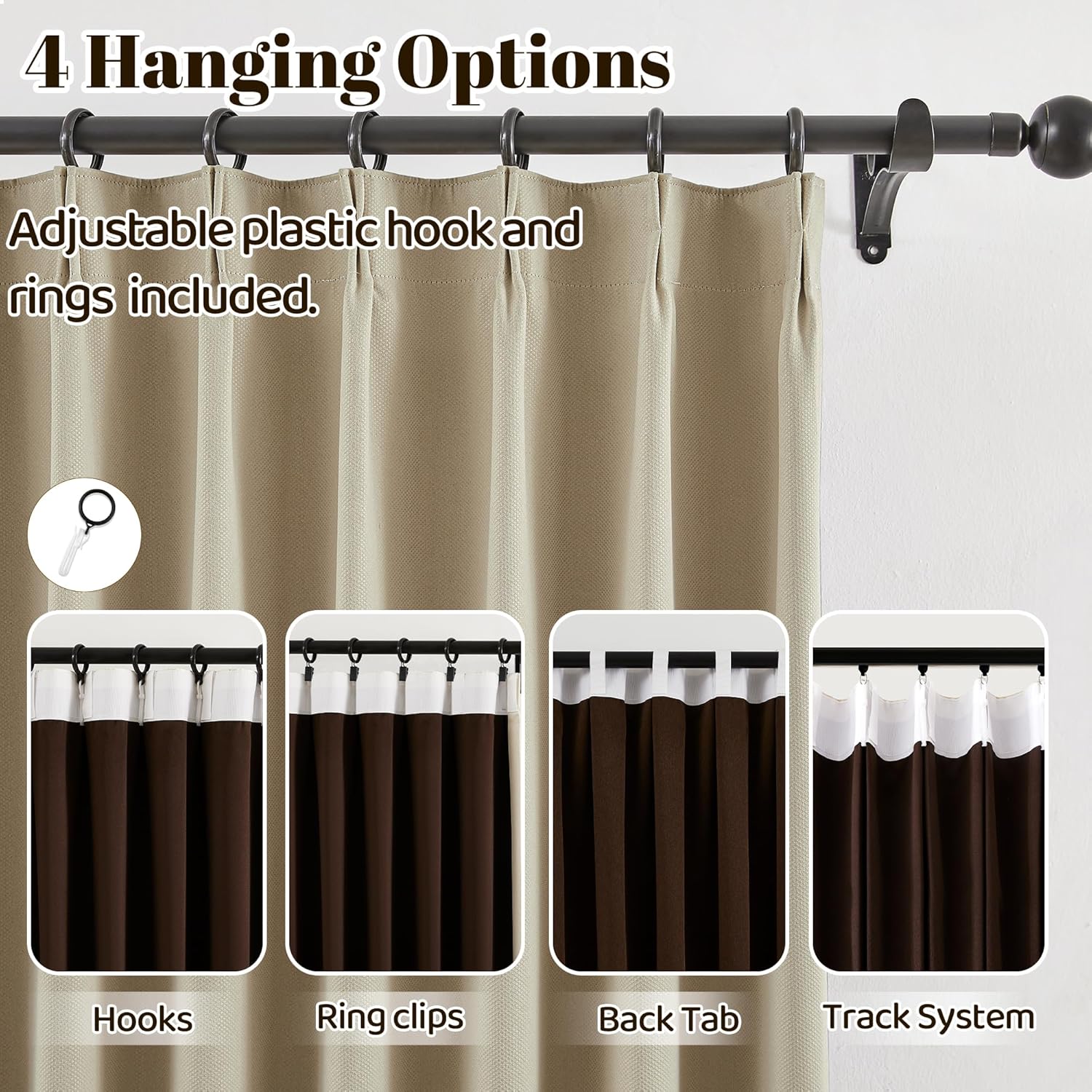 Brand: InMemory Size: 40"W x 84"L (Pack of 2) Customized Sizes Available Color: Beige-waffle Material: Fabric Ready Made: Each package includes 2 panels of Blackout pinch pleated drapes, comes with curtain rings and plastic hooks (pls kindly note that plastic hooks have been inserted onto the tops of curtains when production, curtain rings are packed separately), Each panel measures 40 inches wide by 84 inches long, Each set with 14 pinch pleats, total 80 inches wide, ensuring full coverage of any window for maximum privacy and style. 100% Blackout Curtains: Our full blackout pinch pleated curtains provide complete darkness and privacy, thus giving you a good night's sleep. Perfect for night shifter and people who are sensitive to the light, seamlessly blend with any home decor style, enhancing the elegance and sophistication of your bedroom, living room, dining room, hallway, patio, nursery, home office. Quality & Craftsmanship: These pleated curtains panels are made of triple weave double layer thermal insulated blackout waffle Textured fabric, have permanent sewn-in pleats for a more luxurious look, whichs bring a touch of sophistication and elegant style. Each panel has made memory shape trained at 218°F, which can help curtains to retain a organized shape and looks neater like custom. Hanging Options: 1: Hanging with our hooks and rings to easy slide and creat a classic pleated effect. 2: Using back tab to hide the rod, easy to hang and showcase a casual look. 3: Using our adjustable hooks for track system. 4: Using clip rings(not included). Say goodbye to the hassle of ordering accessories separately. Easy Care: Machine washable with cold water and mild detergent, Curtains after high temperature setting Any creases from packaging can be easily smoothed out with light ironing or steaming (back ) (the reverse side), If you have any questions about the curtain, please send an email to contact us, we will help you solve as soon as possible.