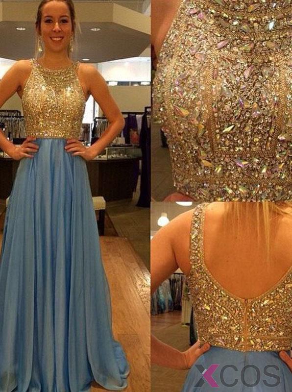 Luxurious A-line Sequined Crew Long Chiffon Prom Dress Party Dress